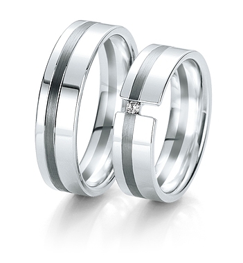 Diese Eheringe, Trauringe werden aus 585 Weiss und Graugold angefertigt. Der Damenring wird mit einem 0,03 ct W-si Brillant gefasst.