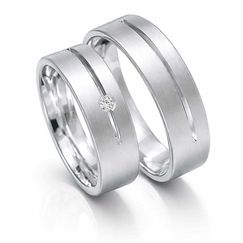 Beide Ringe sind 6 mm breit und 1,9 mm stark. Die fein mattierte Oberfläche wird durch eine präzise durchgefräste Rille aufgelockert, die den Schmuckstücken eine elegante Note verleiht.