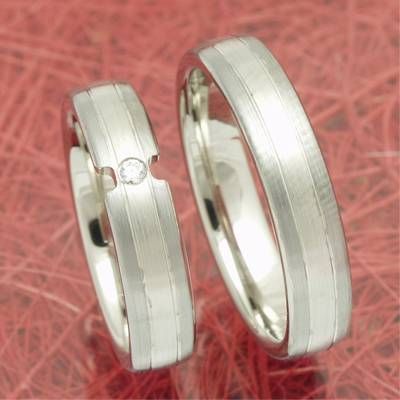 Diese Eheringe aus 585 Weißgold vereinen helles und dunkles Weißgold in einer modernen, eleganten Gestaltung. Der Damenring wird durch einen 0,03 ct W-si Brillanten veredelt, der ihm einen feinen, funkelnden Akzent verleiht.