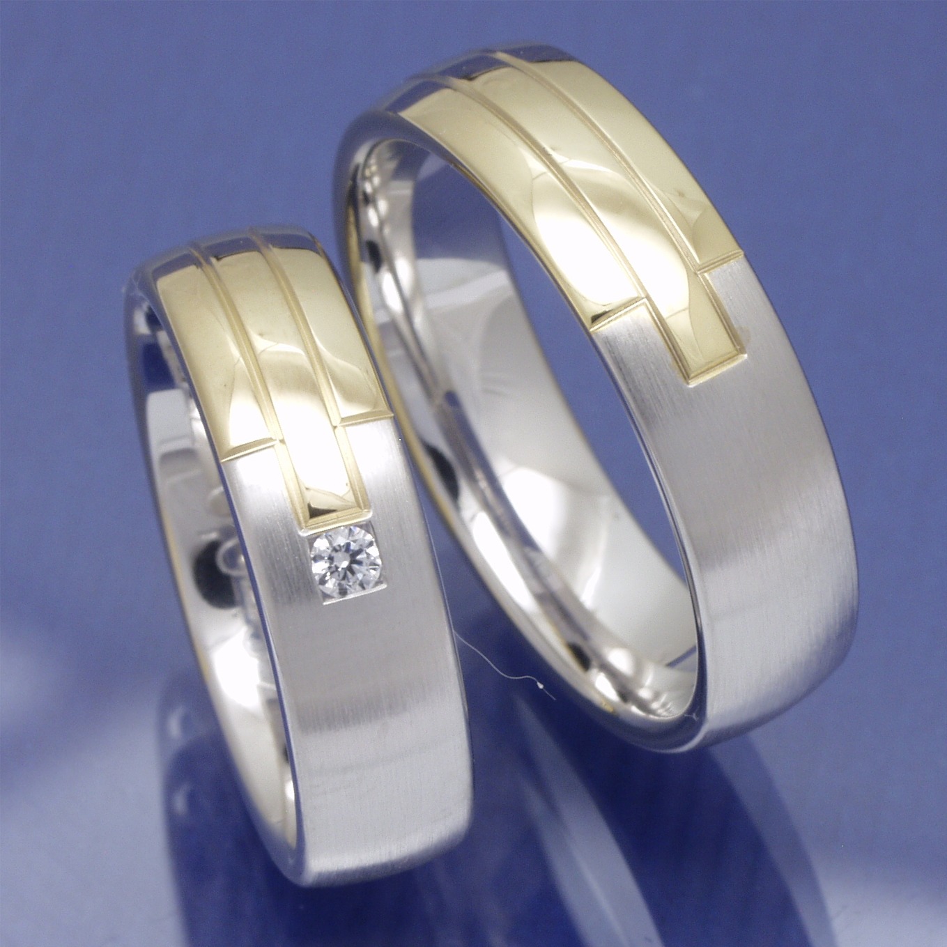 Eheringe, Trauringe aus 585 Gelbgold und Weissgold. Der Damenring ist mit einem 0,045 ct W-si Brillant gefasst.