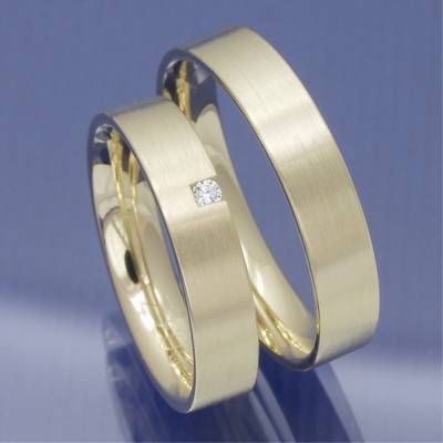 Diese Trauringe werden aus 585 Gelbgold angefertigt und der Damenring mit einem 0,03 ct TW-if Brillant gefasst.
