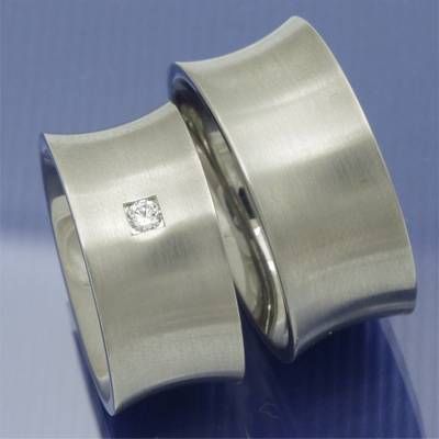 Diese Trauringe werden aus Edelstahl für Sie angefertigt. Beide Ringe sind 11 mm breit, die Ringe werden mattiert und der Damenring mit einem Brillant von 0,090 ct w-si gefasst. Beide Ringe sin konkave.