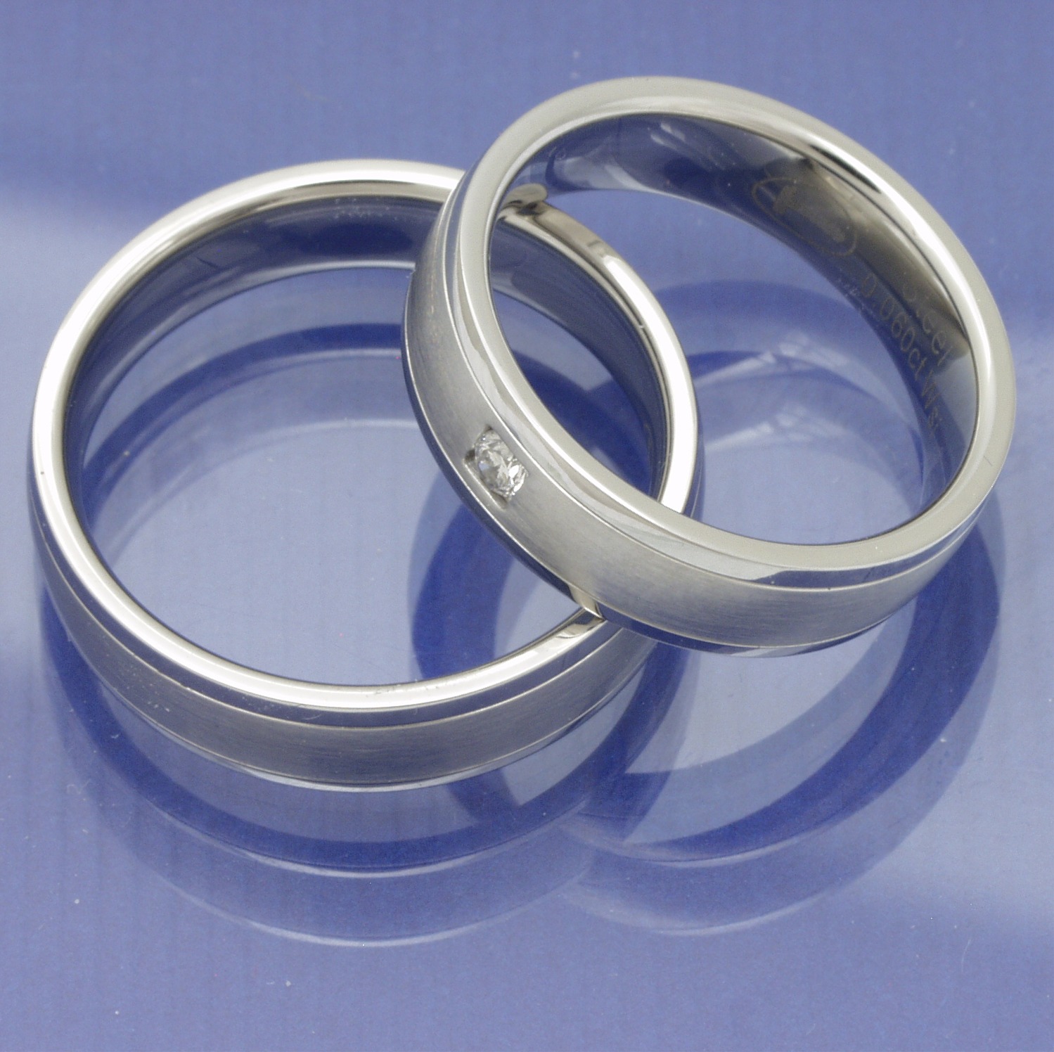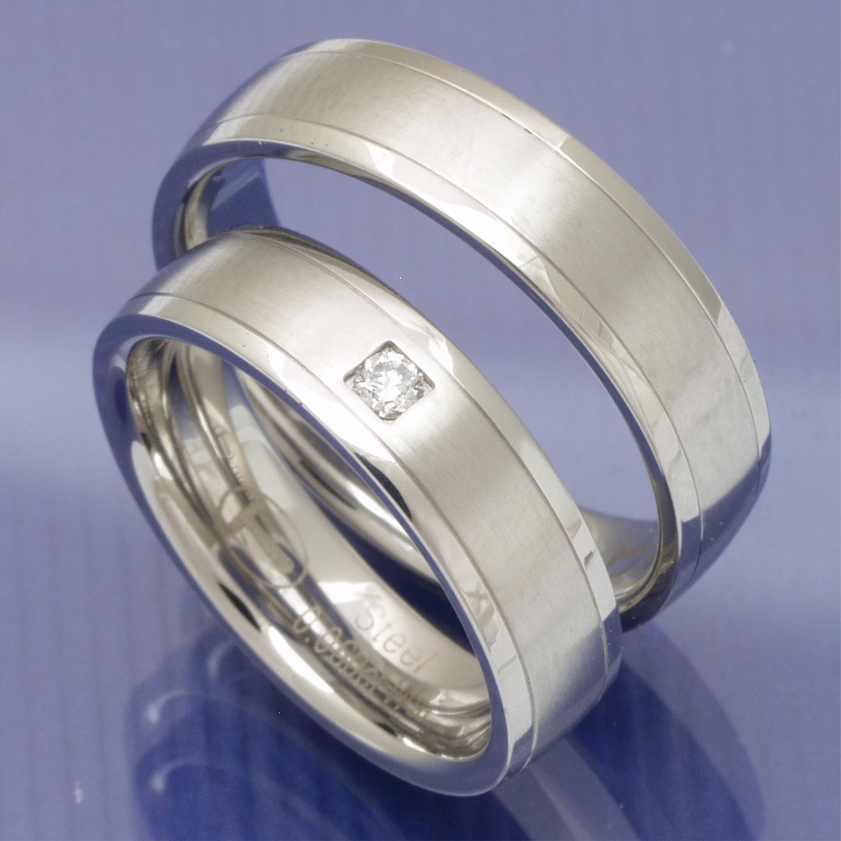 Diese Trauringe von Collection Ruesch aus der Serie Steel Evolution werden wie der Name schon sagt, aus Edelstahl angefertigt. Der Damenring wird mit einem Brillanten von 0,060 ct w-si gefasst. Die Edelstahlringe werden mattiert und hochglanz poliert. Mit diesen Trauringe haben Sie eine günstige Alternative zu anderen Trauringen aus Weißgold oder Platin.