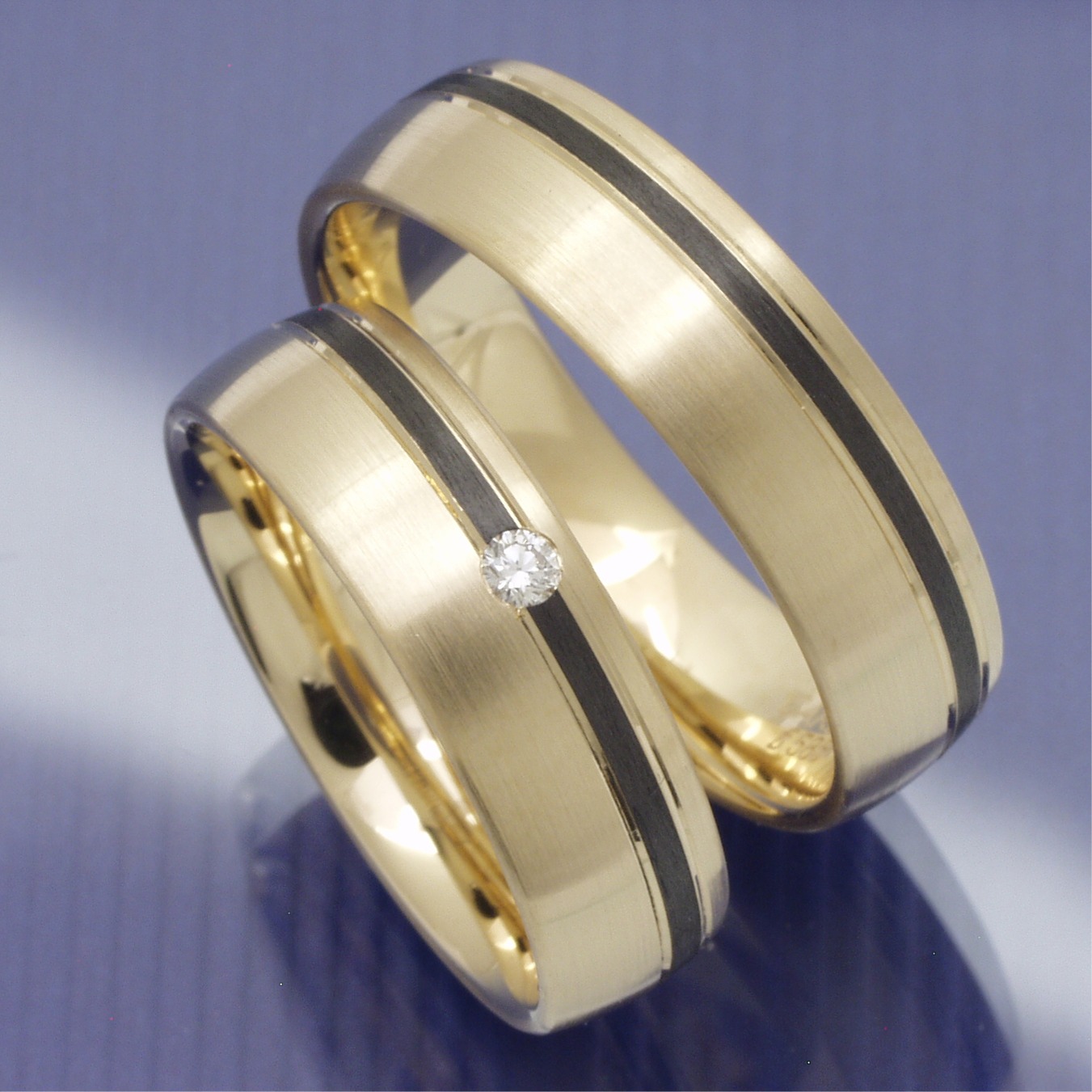 Carbon ist ein Faser-Kunststoff-Verbundwerkstoff. Eigentlich hat Carbon, das bisher hauptsächlich im Fahrzeugbau verwendet wird, nur Vorteile: es ist bei sehr großer Festigkeit extrem leicht, es ist nahezu beliebig formbar, es rostet nicht und es kann bei einem Zusammenstoß sehr viel Energie absorbieren. Diese Vorteile werden nun auch im Schmuckbereich genutzt und für diese unverwechselbaren Trauringe verwendet.