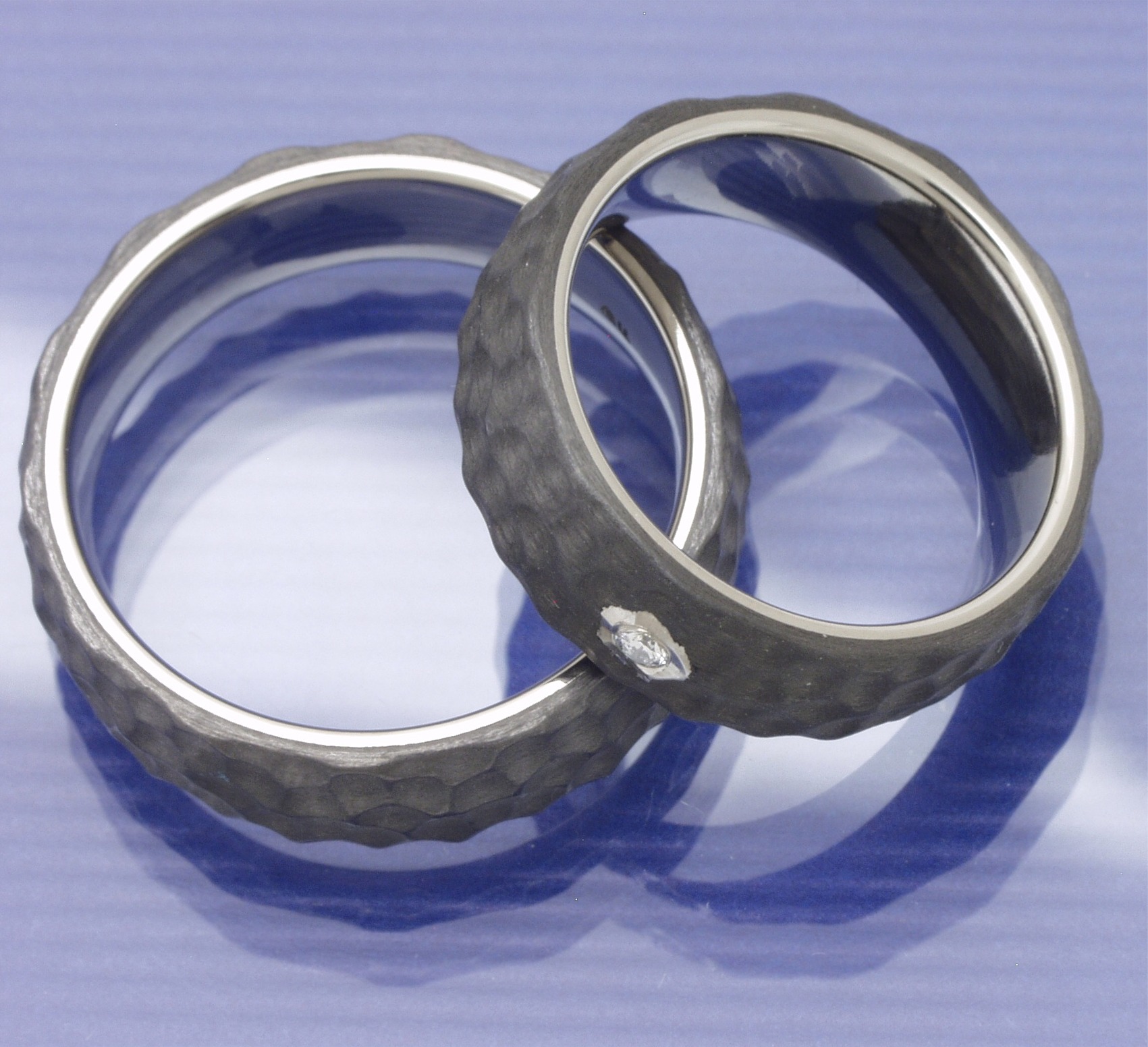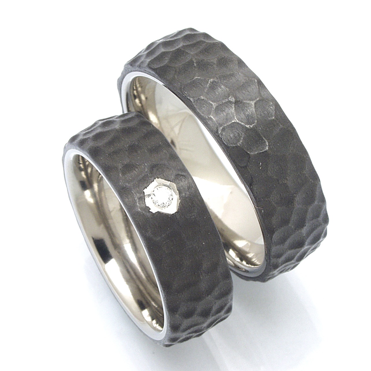 Diese besonderen Trauringe werden für Sie aus Titan und Carbon angefertigt. Der Damenring wird mit 0,03 ct w/si Brillant gefasst. Beide Ringe haben eine Hammerschlagoptik.