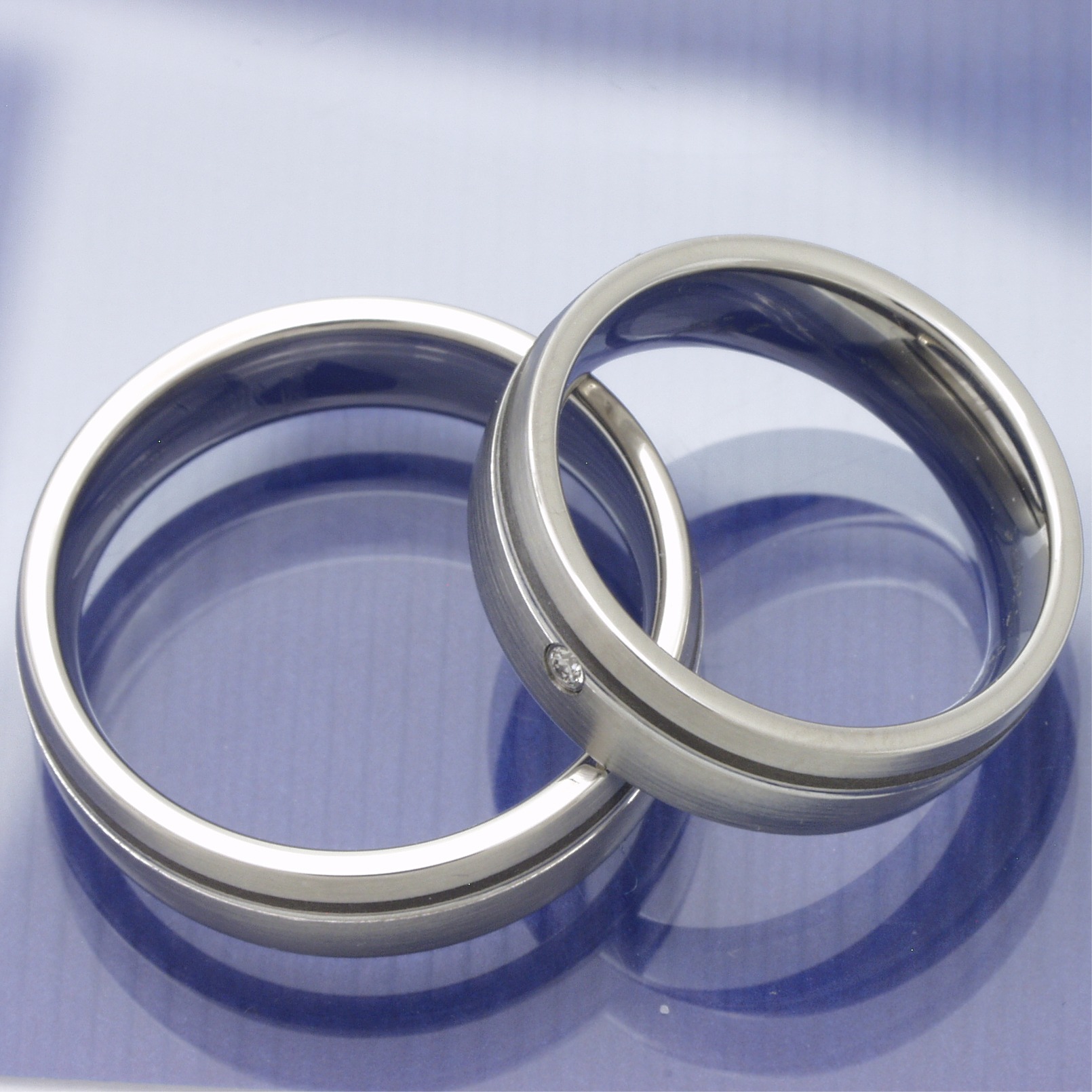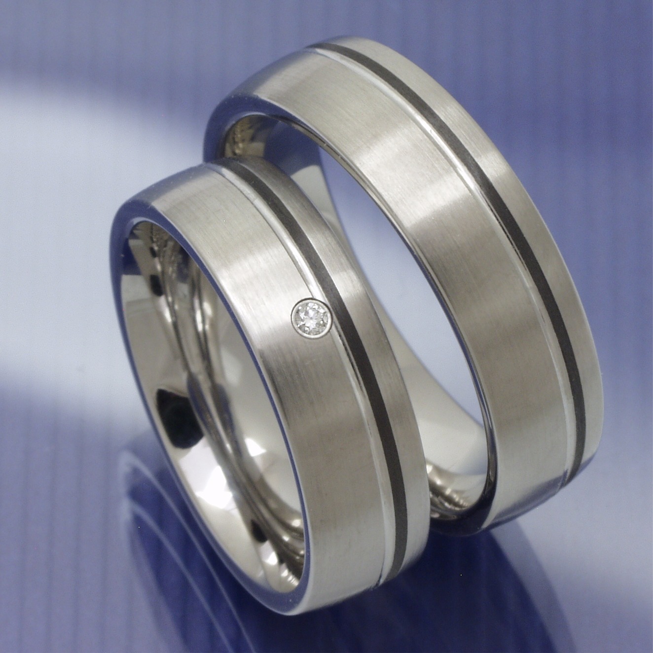 Diese Trauringe werden für Sie aus Edelstahl und Carbon angefertigt. Die Ringe haben einen besonderen Tragekomfort. Der Damenring wird im Edelstahl mit einem 0,015 ct w/si Brillant gefasst.