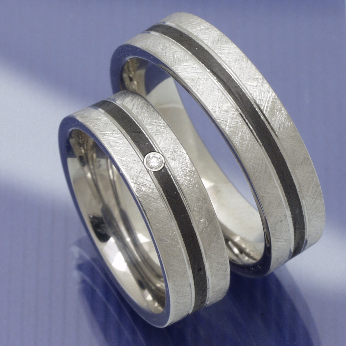 Diese Trauringe werden für Sie aus Edelstahl und Carbon angefertigt. Beide Ringe haben eine Eismatt Oberfläche und einen besonderen Tragekomfort. Der Damenring wird mit einem 0,015 ct w/si Brillant ine einer Edelstahlfassung im Carbon gefasst.