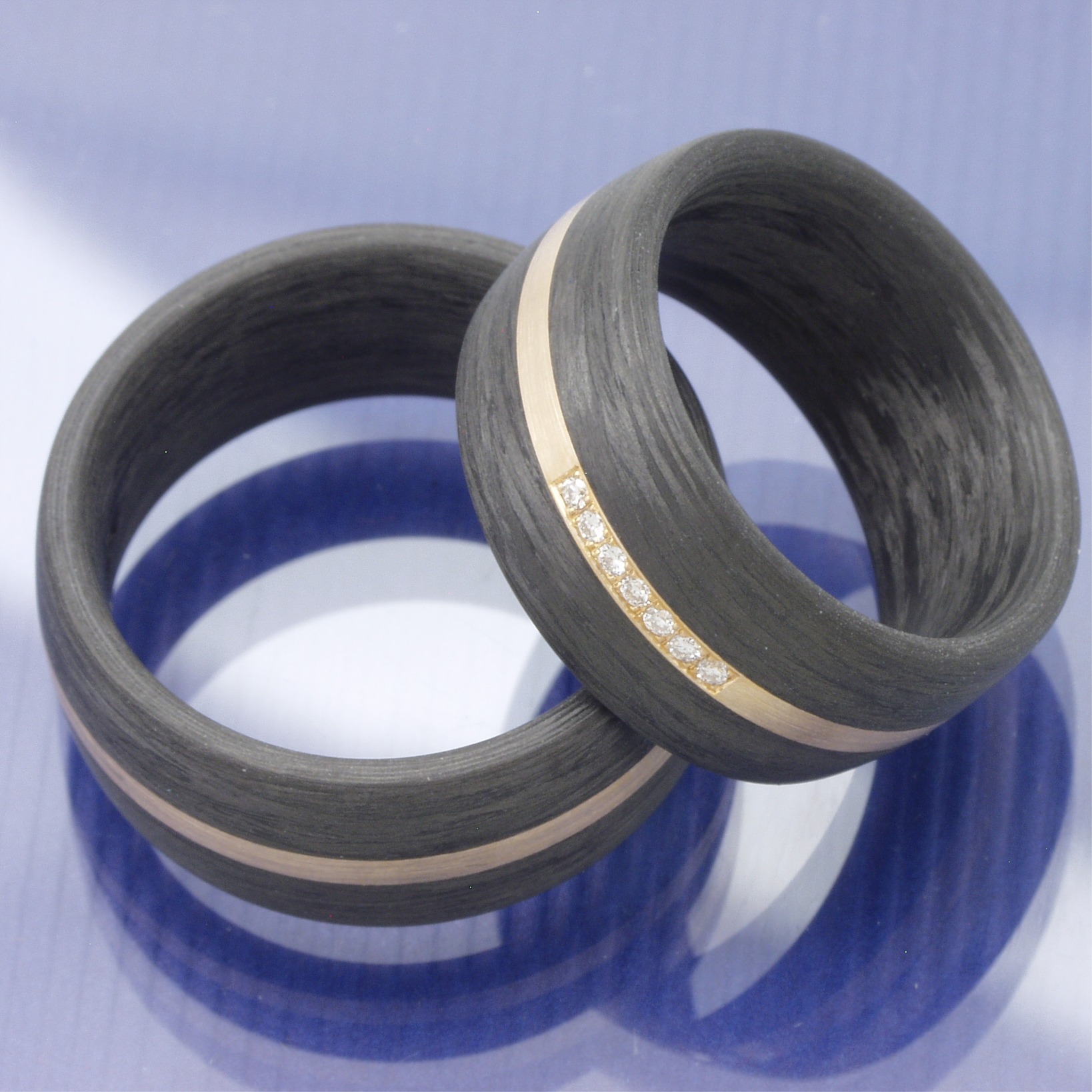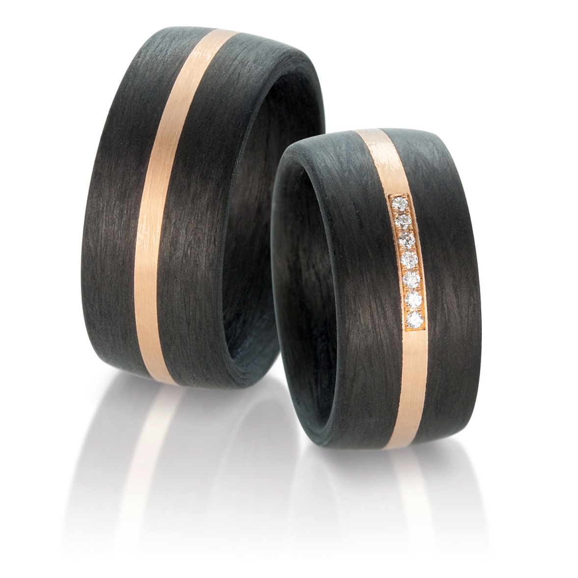 Diese edlen Carbon Trauringe werden aus Carbon und 585 Roségold für Sie angefertigt. Der Damenring wird im Goldstreifen mit 0,05 ct W-si Brillanten gefasst.
