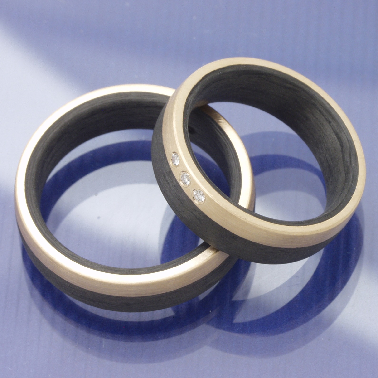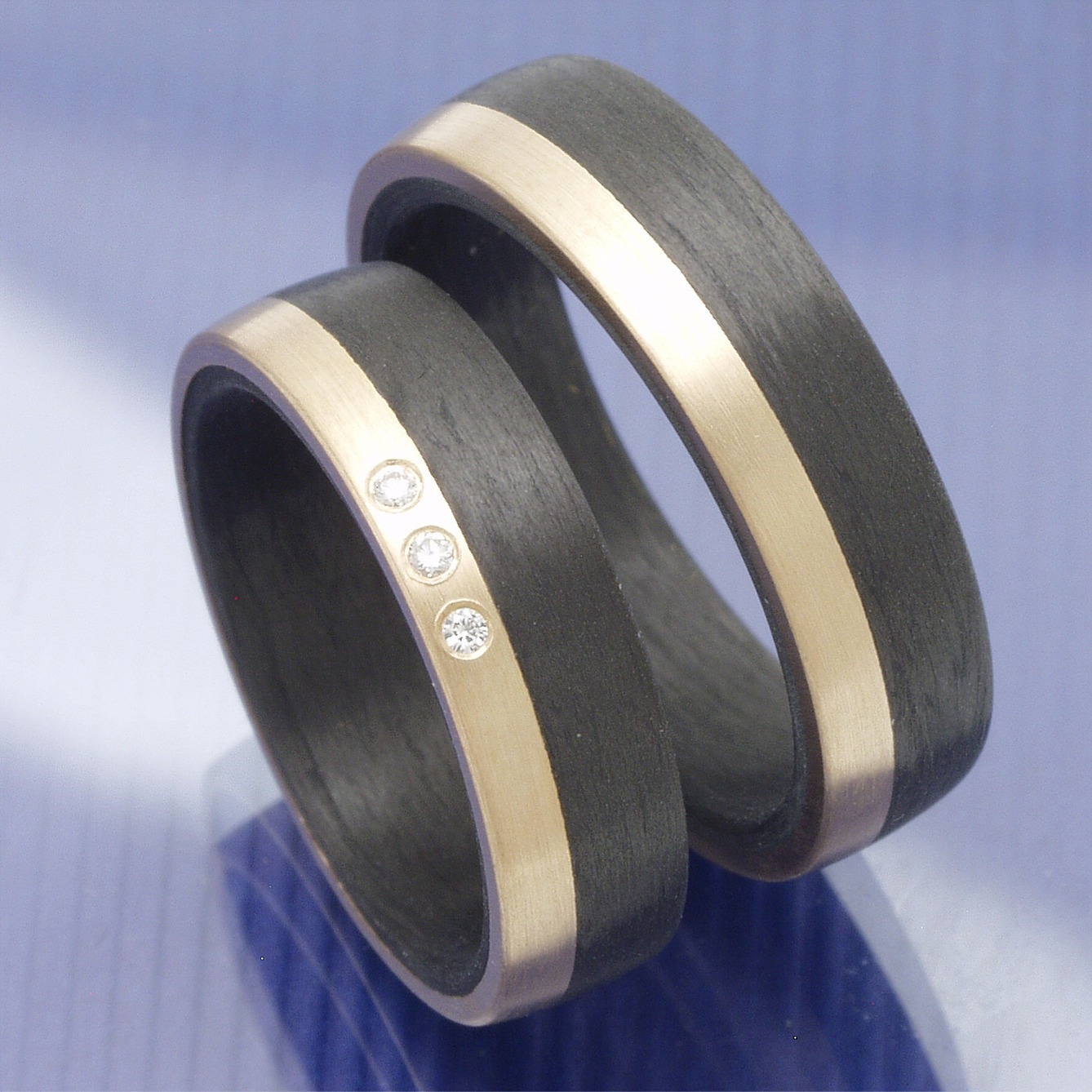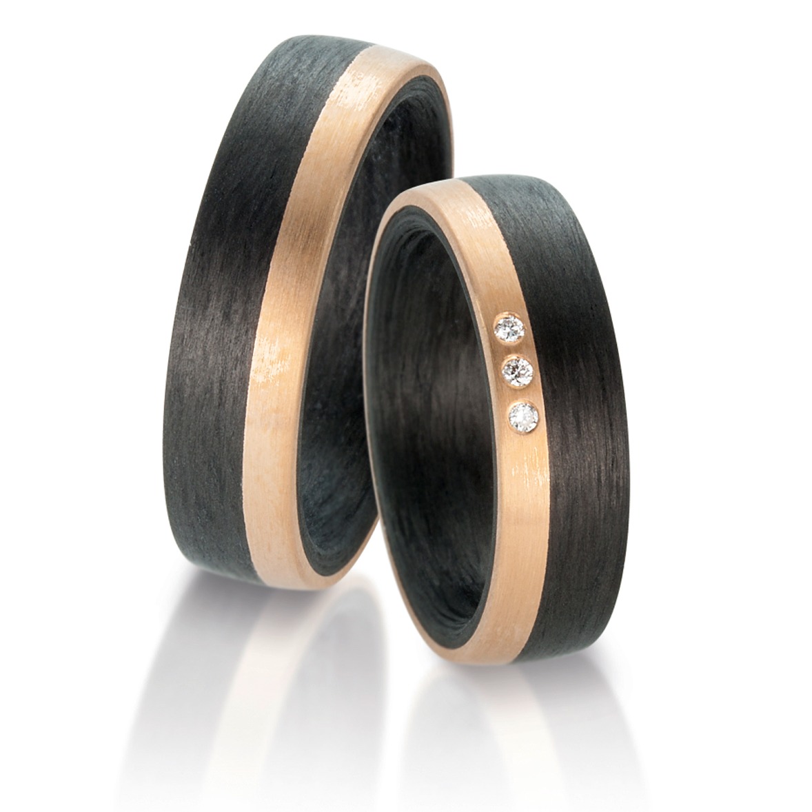 Diese edlen Carbon Trauringe werden aus Carbon und 585 Roségold für Sie angefertigt. Der Damenring wird im Goldstreifen mit drei Brillanten von zusammen 0,03 ct W-si gefasst.