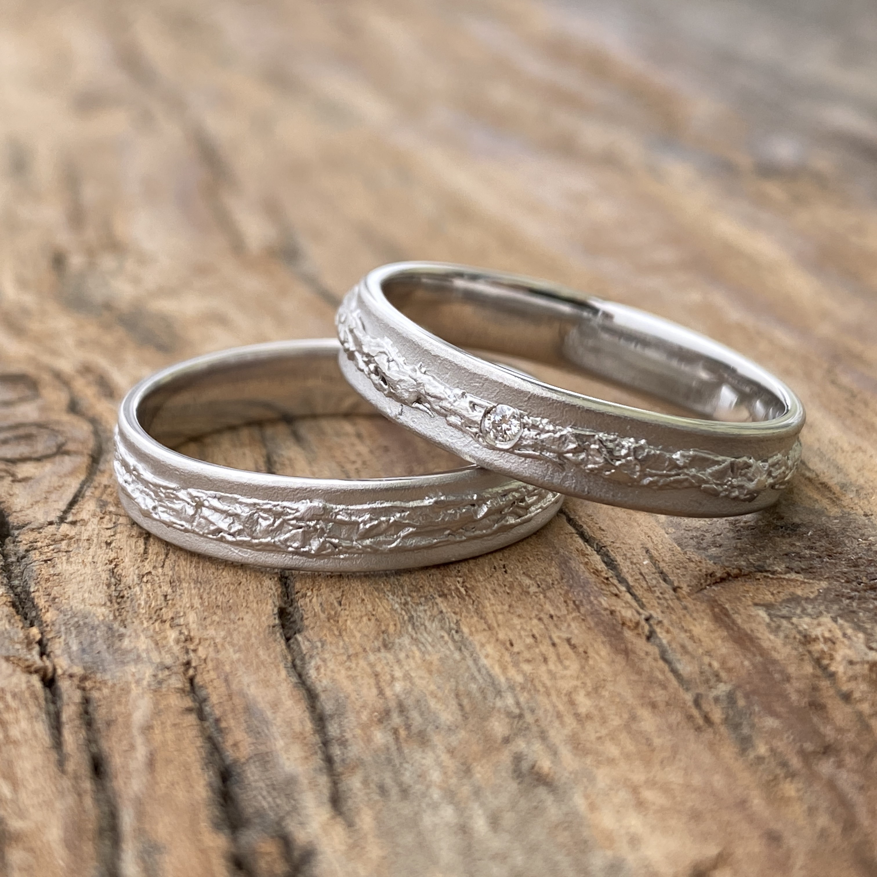 Diese ausgefallenen Trauringe werden aus rhodiniertem 925 Silber angefertigt. Die Ringe haben eine besondere strukturierte Oberfläche. Jeder Ring ist ein von Hand gefertigtes Unikat, einzigartig und unverwechselbar. Rechnen Sie daher mit einer Anfertigungszeit von ca. 14 Tagen ab Zahlungseingang. Der Damenring wird in einem 0,020 ct TW-vsi Brillanten gefasst.