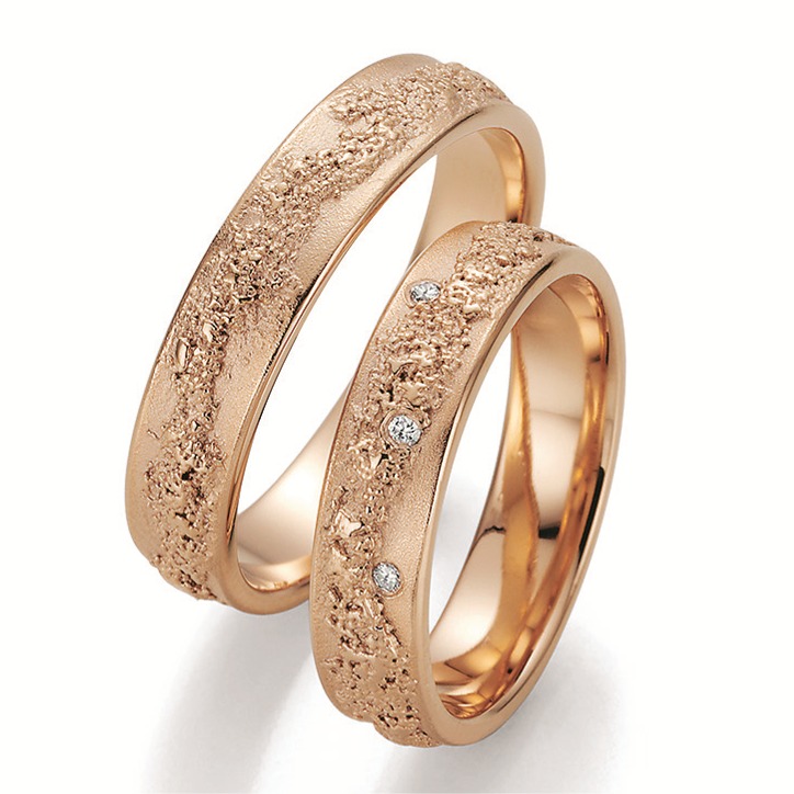 Diese ausgefallenen Trauringe werden aus 925 Silber angefertigt. Beide Ringe werden 585 Apricotgold plattiert. Die Ringe haben eine besondere strukturierte Oberfläche. Jeder Ring ist ein von Hand gefertigtes Unikat, einzigartig und unverwechselbar. Rechnen Sie daher mit einer Anfertigungszeit von ca. 14 Tagen ab Zahlungseingang. Der Damenring wird mit 0,024 ct TW-vsi Brillanten gefasst.