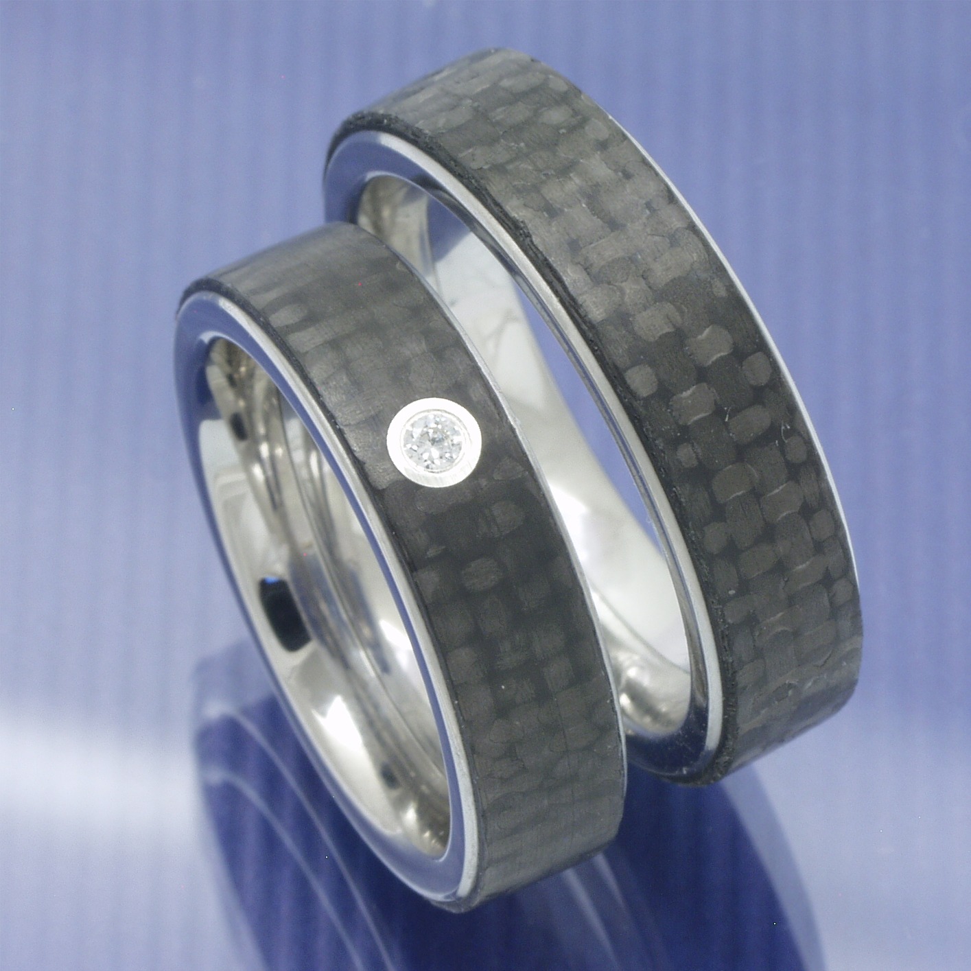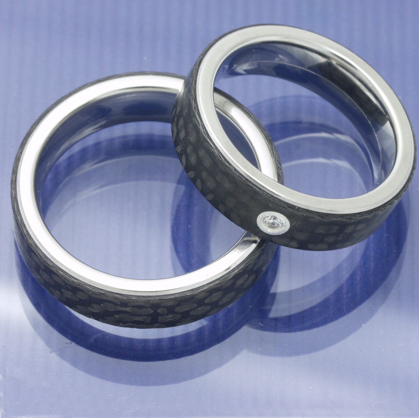 Diese Trauringe werden für Sie aus Edelstahl und Carbon in Straubenhardt bei Pforzheim angefertigt. Die Ringe haben einen besonderen Tragekomfort. Der Damenring wird in einer Edelstahlfassung mit einem Zirkonia gefasst.