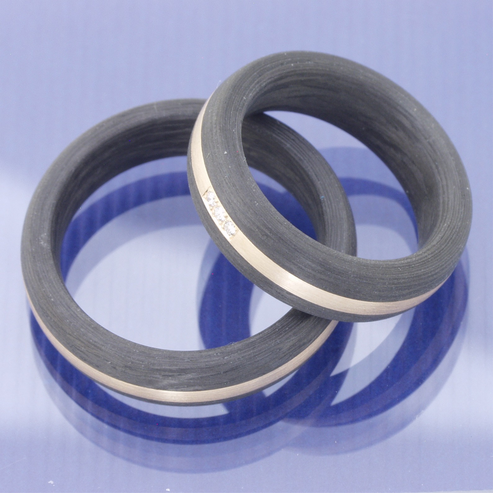 Diese edlen Carbon Eheringe werden aus Carbon und 585 Roségold für Sie angefertigt. Der Damenring wird im Goldstreifen mit drei Brillanten von zusammen 0,02 ct W-si gefasst.