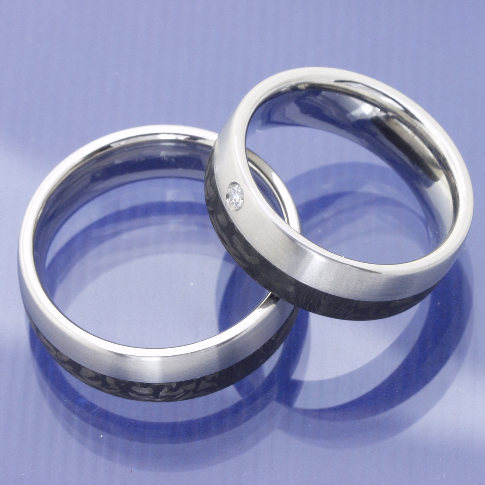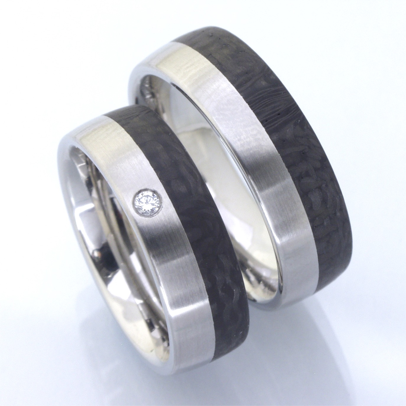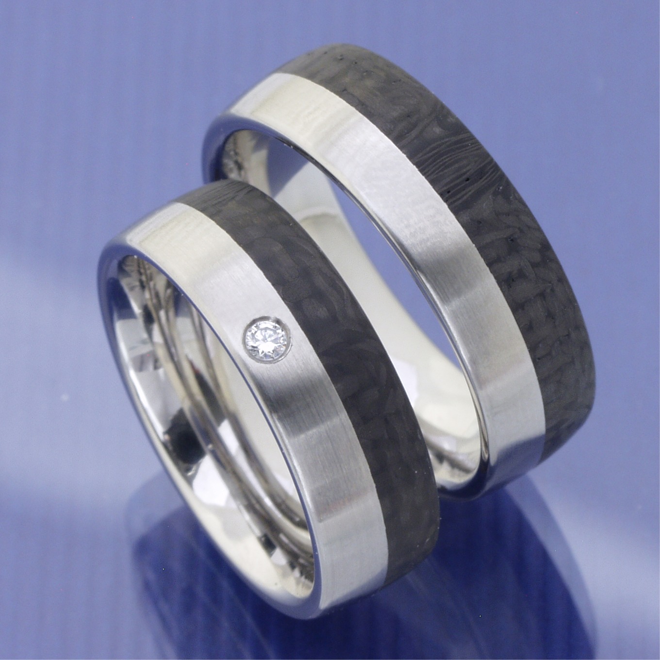 Verlobungsringe die für Sie aus Edelstahl und Carbon angefertigt werden. Das Carbon und Edelstahl ist bei diesen Verlobungsringen mittig getrennt. Die Edelstahlseite der Ringe wird mattiert. Der Damenring bekommt im Edelstahlteil einen Zirkonia. Auch diese Ringe können auf der Innenseite mit einer kostenlosen Gravur versehen werden.