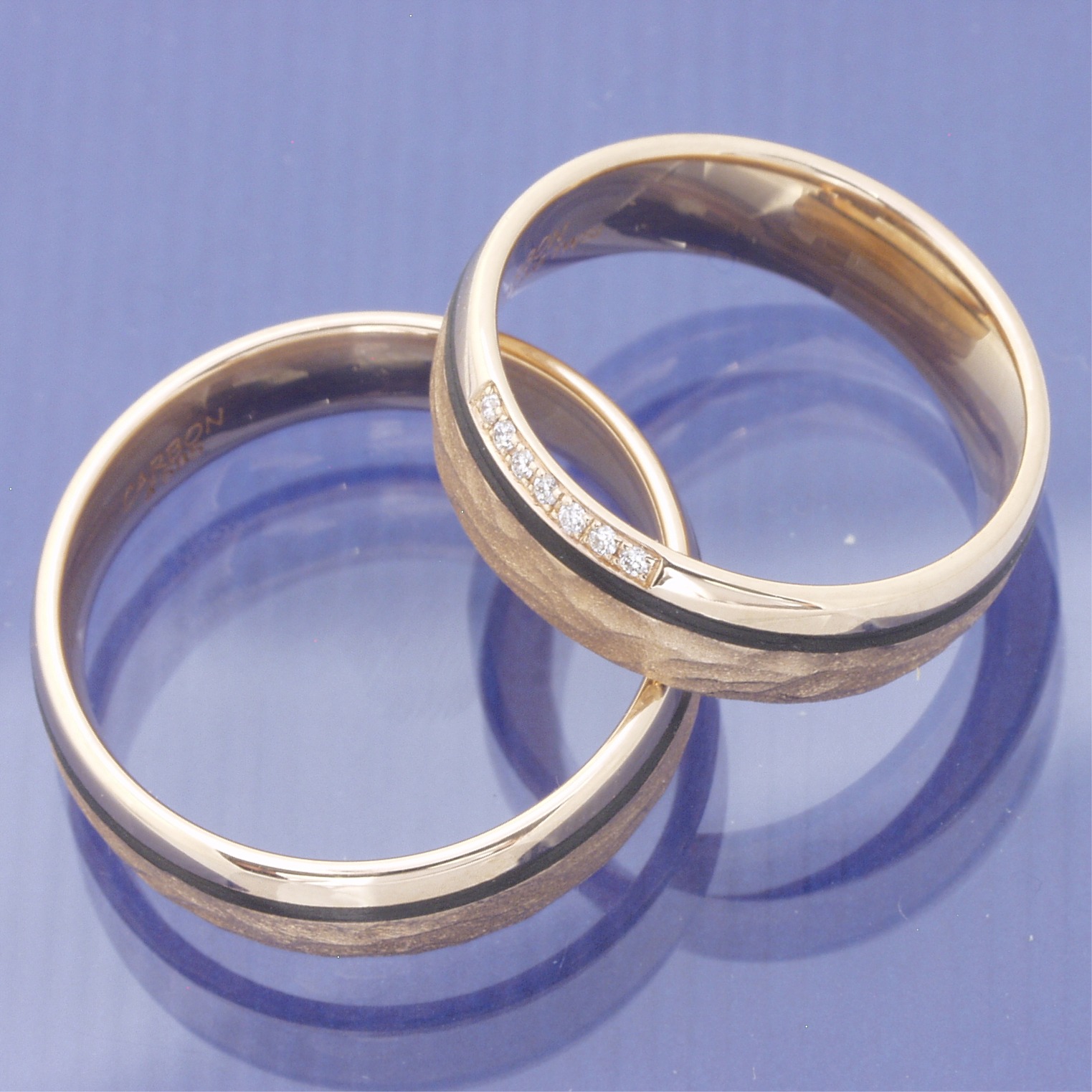 Trauringe aus Rotgold und Carbon mit Hammerschlag-Optik