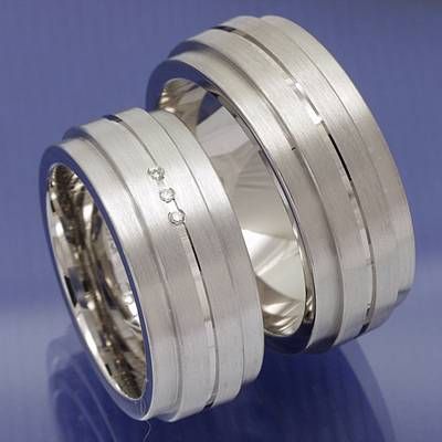 Diese Verlobungsringe und Trauringe werden aus rhodiniertem 925 Silber angefertigt. Beide Ringe haben eine mattierte Oberfläche und eine umlaufende Glanzrille, der Damenring ist mit 0,0165 ct w-si Diamanten gefasst.