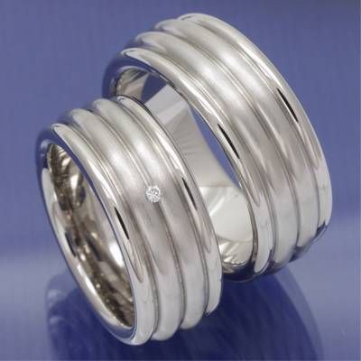 Diese Verlobungsringe und Trauringe werden aus rhodiniertem 925 Silber angefertigt. Beide Ringe haben eine mattierte und glänzende Oberfläche, der Damenring ist mit einem 0,015 ct w-si Diamant gefasst.