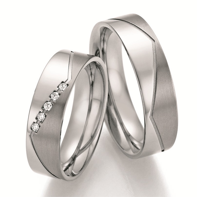 Titan Partnerringe aus der Serie Avantgarde. Der Damenring ist mit 0,100 ct w-si Brillanten gefasst.