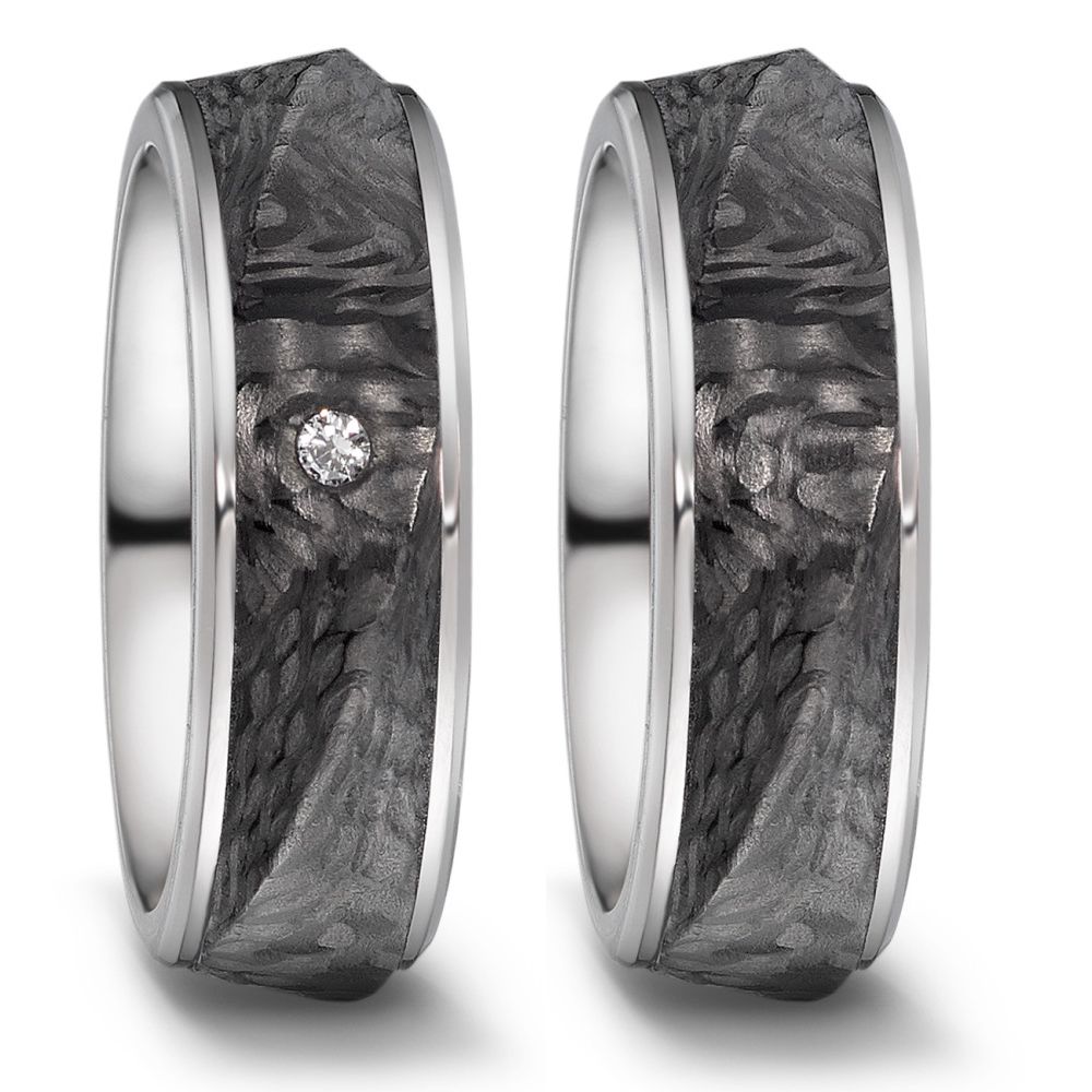Partnerringe aus Titan und Carbon. Der Damenring wird mit einem 0,03 ct w-si Brillant