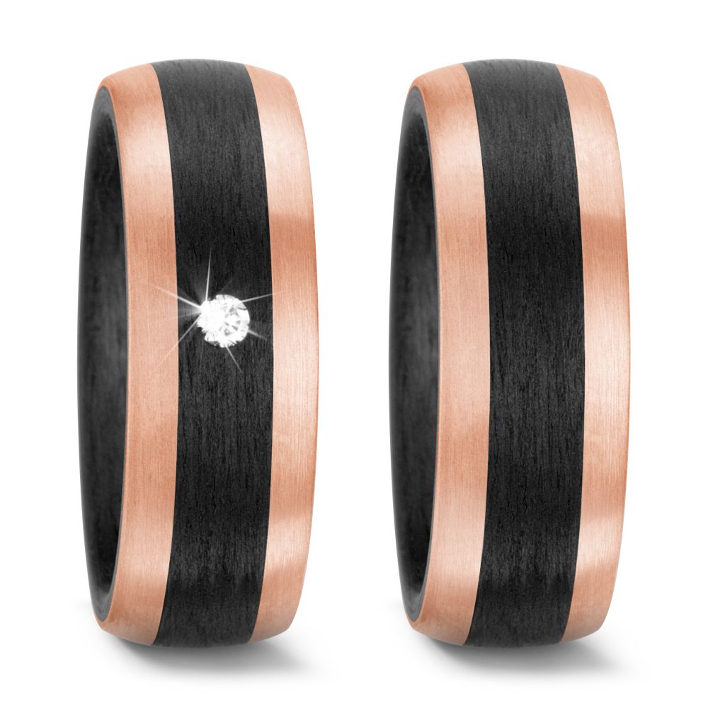 Partnerringe aus 585 Rosegold und Carbon. Der Damenring wird mit einem 0,05 ct w-si Brillant gefasst.