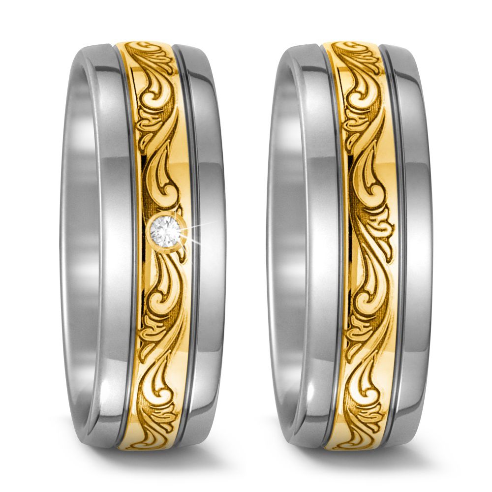 Partnerringe aus Titan und 750 Gelbgold. Der Damenring wird mit einem 0,03 ct w-si Brillant gefasst.