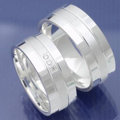 Partnerringe Verlobungsringe Freundschaftsringe aus 925 Silber. Der Damenring ist mit drei Zirkonia gefasst. Diese Ringe werden in der Mitte mattiert und außen mit einer glänzenden Discokugel ähnlicher Oberfläche angefertigt. Diese Ringe sind etwas kantiger wie das Modell 11/0912-04/80