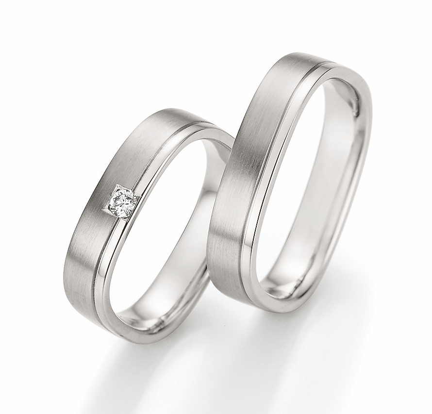 Diese Quadratischen 585 Weissgold Eheringe aus der Serie Solid VII werden aus Weissgold angefertigt. Der Damenring wird mit 0,060 ct W/Si Brillanten gefasst.