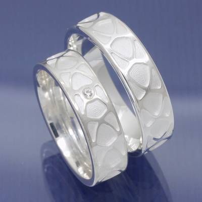 Diese sehr ausgefallenen Designer Verlobungsringe und Partnerringe werden aus 925 Silber angefertigt. Beide Ringe haben eine mattierte strukturierte Oberfläche. Der Damenring wird mit einem Zirkonia gefasst.