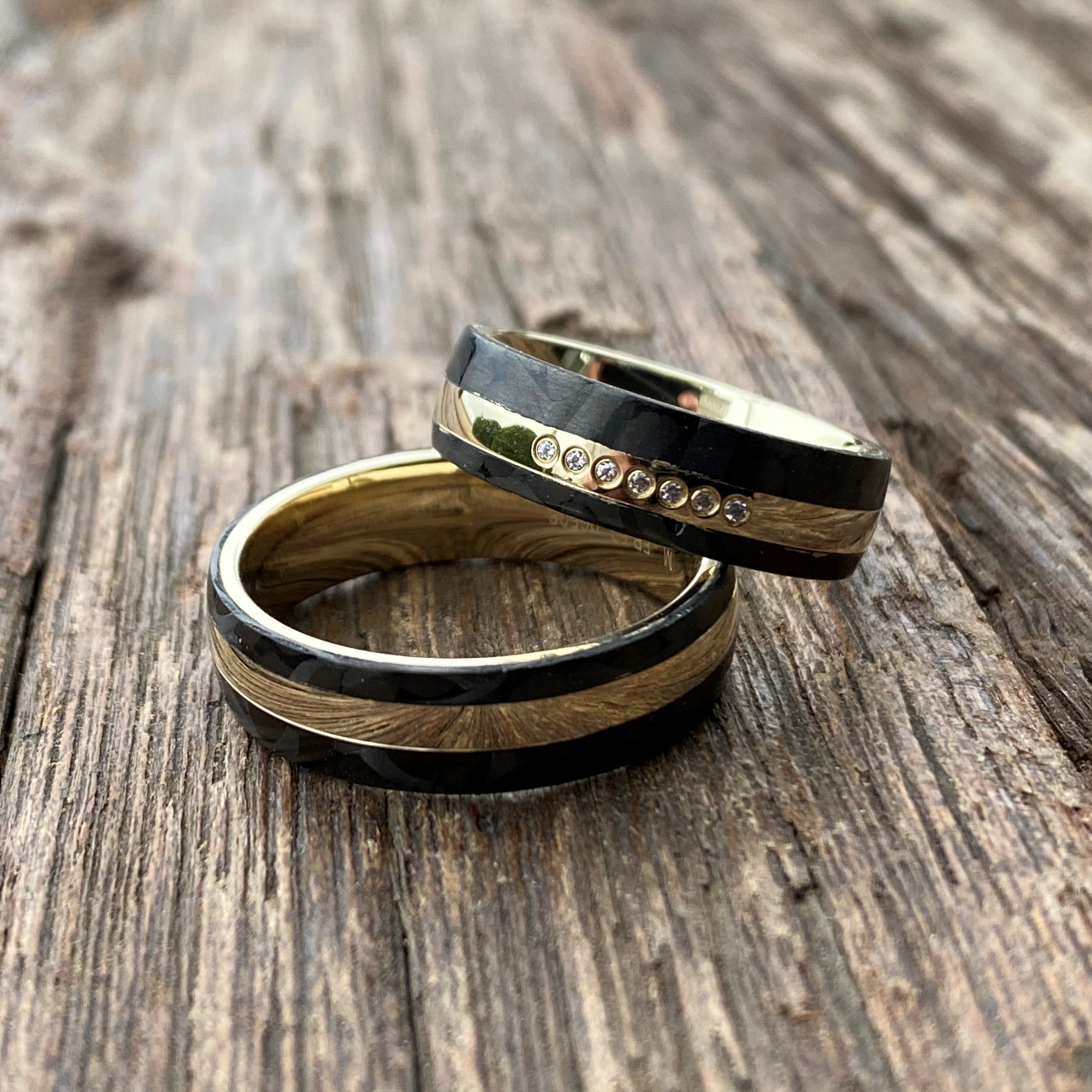Diese Trauringe werden aus 585 Gelbgold mit Carbon angefertigt. Der Damenring wird mit 0,039 ct w/si gefasst.