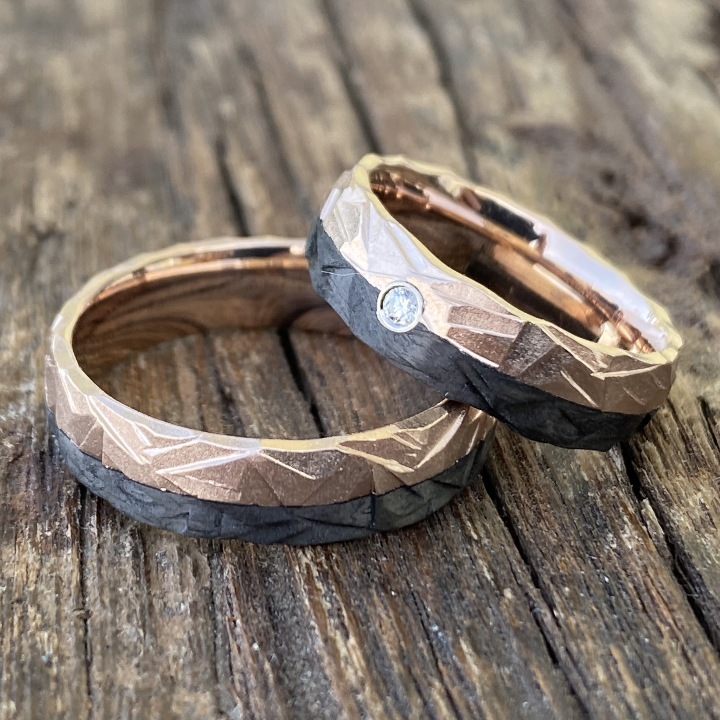 Diese Trauringe zeichnen sich durch ihre außergewöhnliche Kombination aus 585 Caramelgold und Carbon aus, wodurch sie zu einem einzigartigen und faszinierenden Schmuckstück werden. Das Caramelgold verleiht den Ringen eine warme und dennoch moderne Note, während das Carbon für eine markante und einzigartige Oberfläche sorgt, die dennoch äußerst angenehm beim Tragen ist.