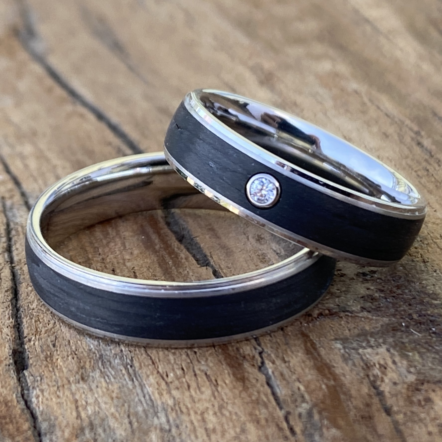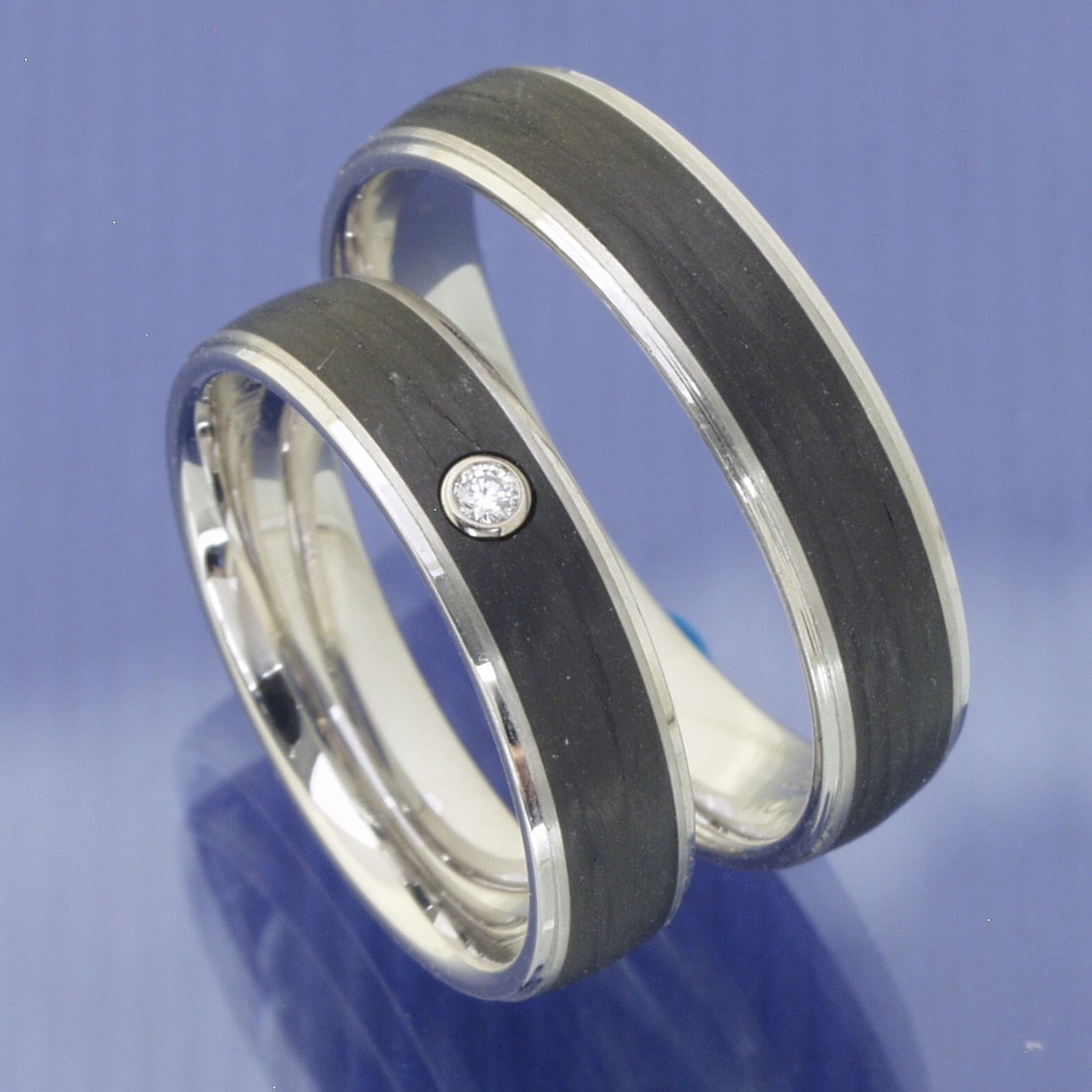Mit einer Breite von 5 mm und einer Stärke von 1,7 mm sind diese Ringe so gestaltet, dass sie eine deutliche Präsenz zeigen, ohne aufdringlich zu wirken. Sie sind komfortabel zu tragen und halten den Anforderungen des täglichen Lebens stand. Das Zusammenspiel des glänzenden Platins mit der dunklen, texturierten Oberfläche des Carbons schafft ein modernes, aber zeitloses Design, das die Persönlichkeit und den gemeinsamen Weg eines jeden Paares widerspiegelt.