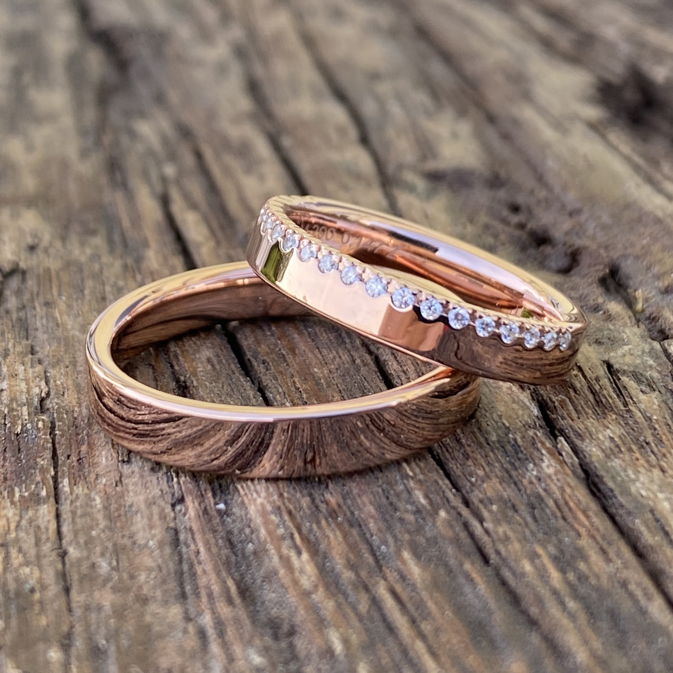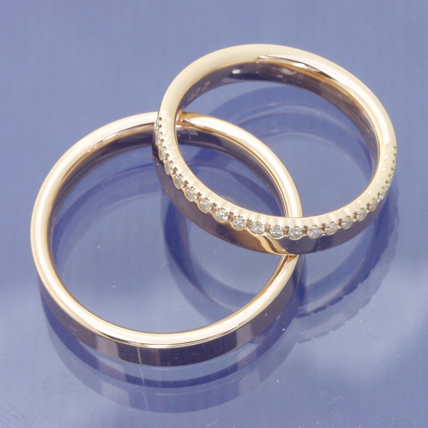 Unsere eleganten Eheringe aus hochglanzpoliertem 585 Rotgold sind die perfekte Wahl für Paare, die zeitlose Schönheit und hochwertigen Schmuck schätzen. Der Damenring ist zusätzlich mit funkelnden Brillanten von insgesamt 0,147 ct in der Qualität G/Si besetzt, die ihm einen besonderen Glanz und eine exquisite Ausstrahlung verleihen.