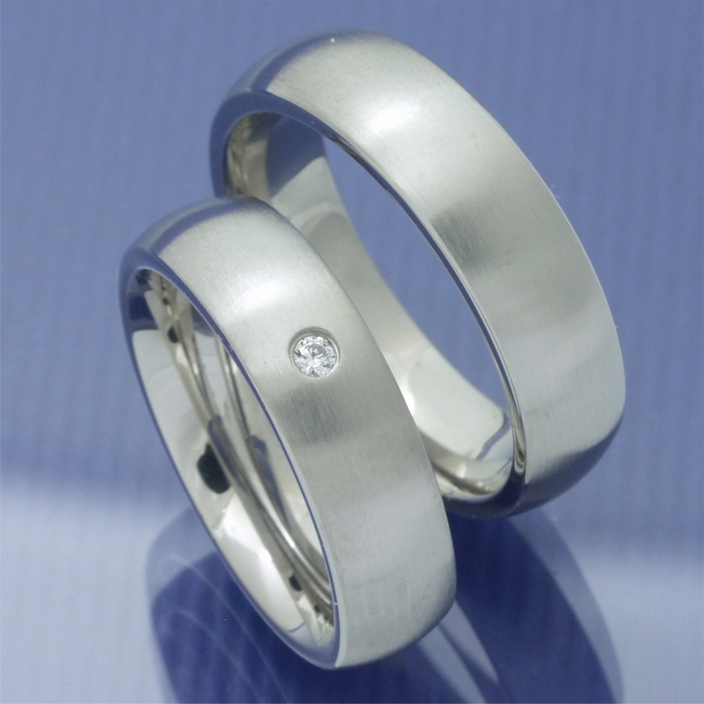 Diese Freundschaftsringe und Trauringe werden aus Edelstahl angefertigt und der Damenring wird mit einem Zirkonia gefasst. Beide Ringe sind innen poliert und außen mattiert.