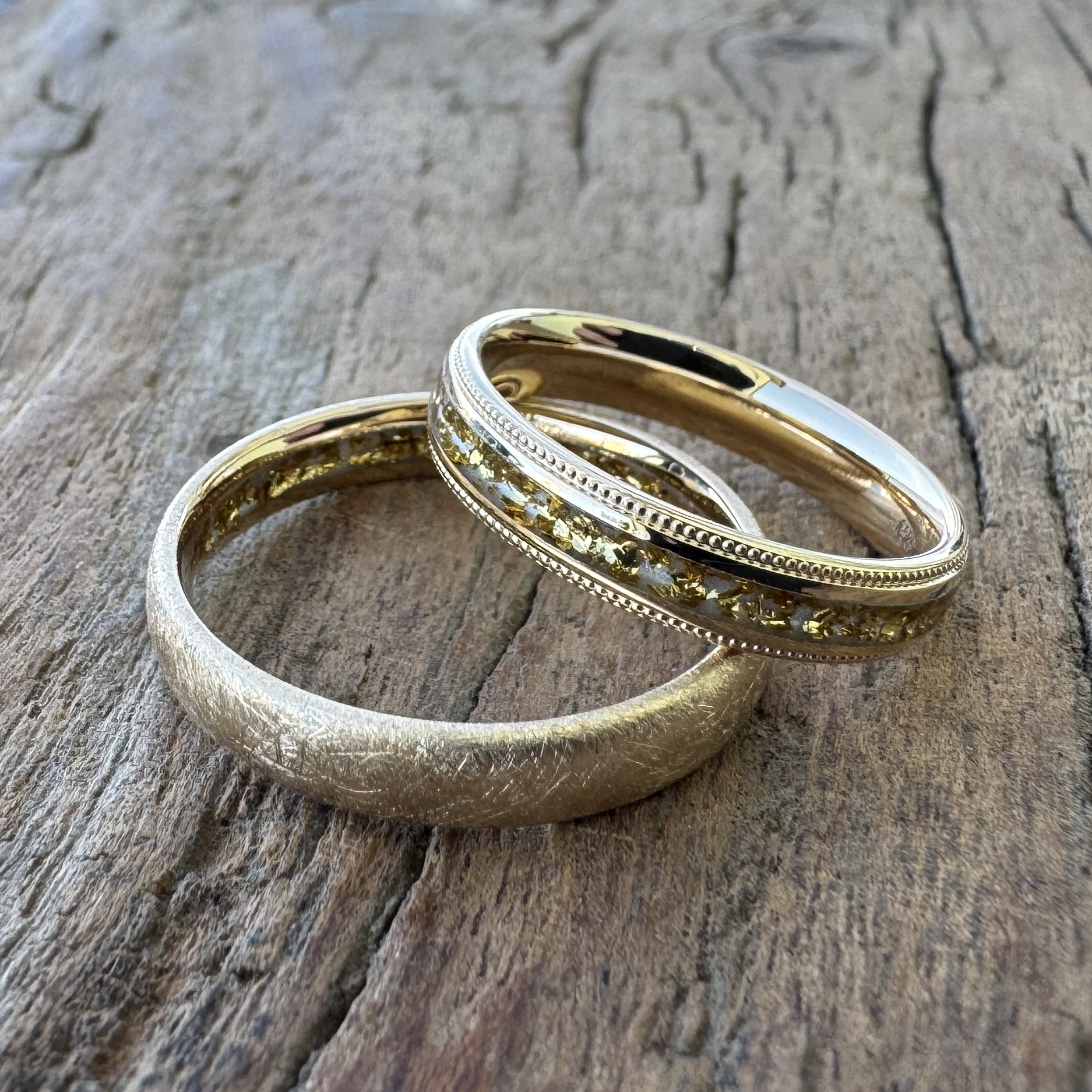 Ein besonderes Highlight ist der edle Gold Flakes Streifen, der den Ringen eine einzigartige Struktur und faszinierende Tiefe verleiht. Beim Damenring liegt der Gold-Flakes-Streifen sichtbar im Zentrum und wird auf beiden Seiten von einem feinen Millgriff eingerahmt. Diese zarte Perlung sorgt für eine elegante, detailreiche Optik und unterstreicht die hochwertige Handwerkskunst.