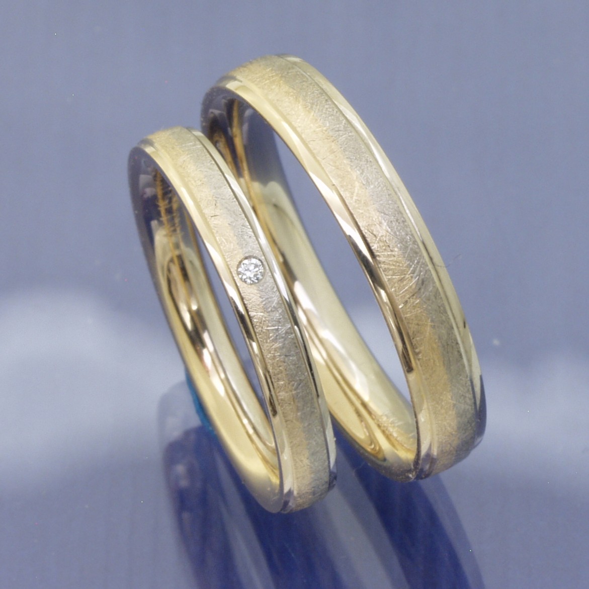 Trauringe aus 375 Mittelgold & Weißgold – eismatt mit Glanzstufen und Brillant