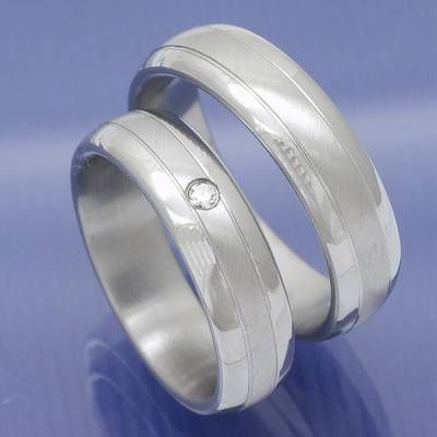 Diese Trauringe und Partnerringe werden aus Edelstahl angefertigt. Die Ringe haben eine glänzende und mattierte Oberfläche. Der Damenring wird mit einem Zirkonia gefasst.