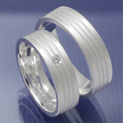 Diese Freundschaftsringe Verlobungsringe "Typ Pauline" werden aus Silber angefertigt. Beide Ringe haben drei umlaufende mattierte Rillen. Der Damenring wird mit einem Zirkonia gefasst.